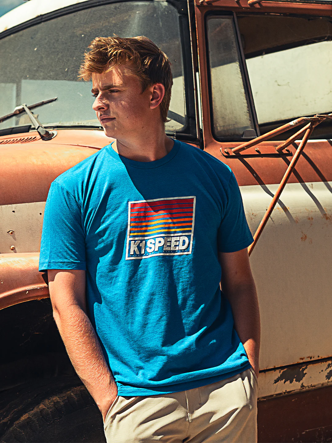 If you’re looking for a shirt that features retro summer vibes, look no further than the Delta t-shirt from K1 Speed. This royal blue shirt features a vintage-inspired color gradient with shades of red, orange and yellow, with K1 Speed in a sleek font and "Live Fast Race Fast" underneath. The shirt is made of high-quality cotton and comes in various sizes for men. The Delta shirt is perfect for adding some color and style to your track day or casual wear.